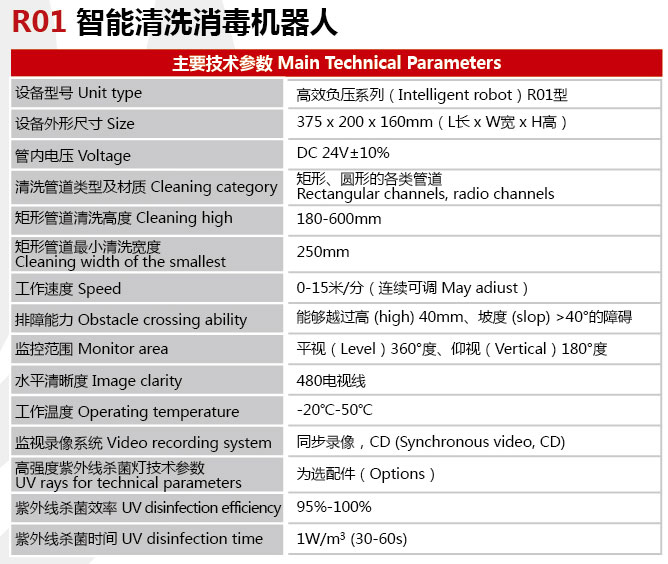对风管清洗机器人的升降系统进行了优化,将之前的电动控制升级为自动控制。由于在中央空调风管清洗工程施工中,由操作工人根据视频画面对清洗毛刷进行升降,很难保证毛刷可以达到准确的风管清洗高度,常因为升起高度不够使风管清洗力度丧失,或高度过高使管道清洗负载过大,最终导致管道清洗效率低下。尤其在被清洗顶壁处于倾斜状态下,以前的设计基本上无法完成风管清洗工作。新款的风管清洗机器人设备设计采用了管道高度自动适应系统,使毛刷随时帖服通风管道顶壁,既保证了风管清洗力度又保证了最高的风管清洗效率。