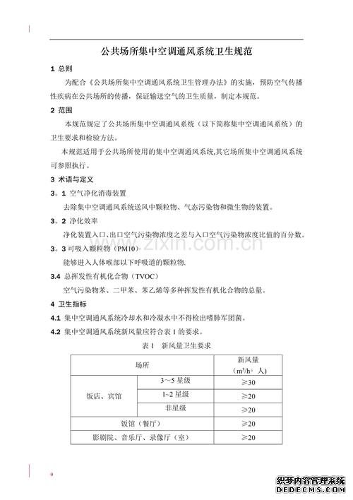 本规范规定了公共场所集中空调通风系统(以下简称集中空调通风系统)的卫生要求和检验方法。 本规范适用于公共场所使用的集中空调通风系统,其它场所集中空调通风系统可参照执行。